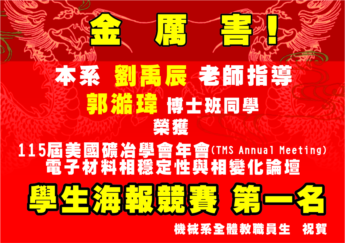 / 恭賀!劉禹辰實驗室榮獲第155屆美國礦冶學會年會(TMS Annual Meeting)電子材料相穩定性與相變化論壇學生海報競賽第一名!