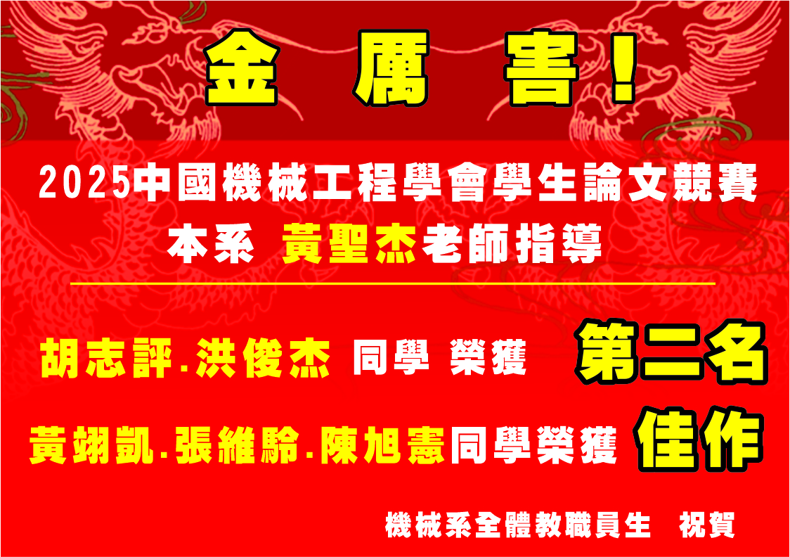/ 恭賀!黃聖杰實驗室榮獲2025中國機械工程學會學生論文競賽